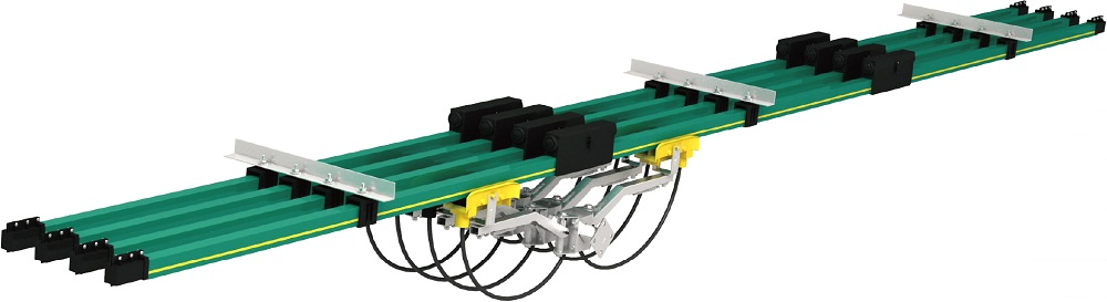 The current collectors are made of carbon brush, reinforced nylon and galvanized or spray-paint metal material. Spring loaded carbon brushes maintain uniform contact. Connecting cables and hinged or flexible towing arms included. Double Current collectors for transfer applications and higher amperage are available.